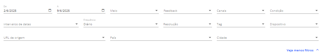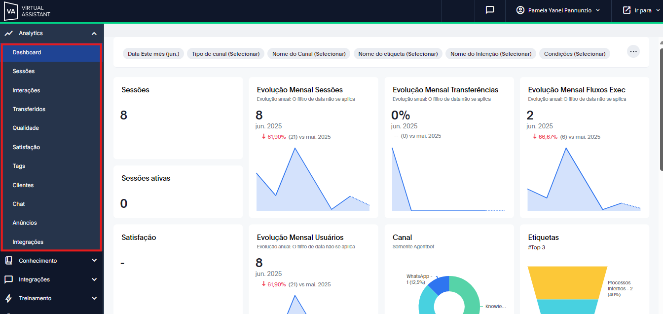 Em cada um deles, você terá um cabeçalho de filtros com diferentes opções que lhe permitirão cruzar dados e avaliar o comportamento do seu assistente virtual, de acordo com diferentes variáveis.